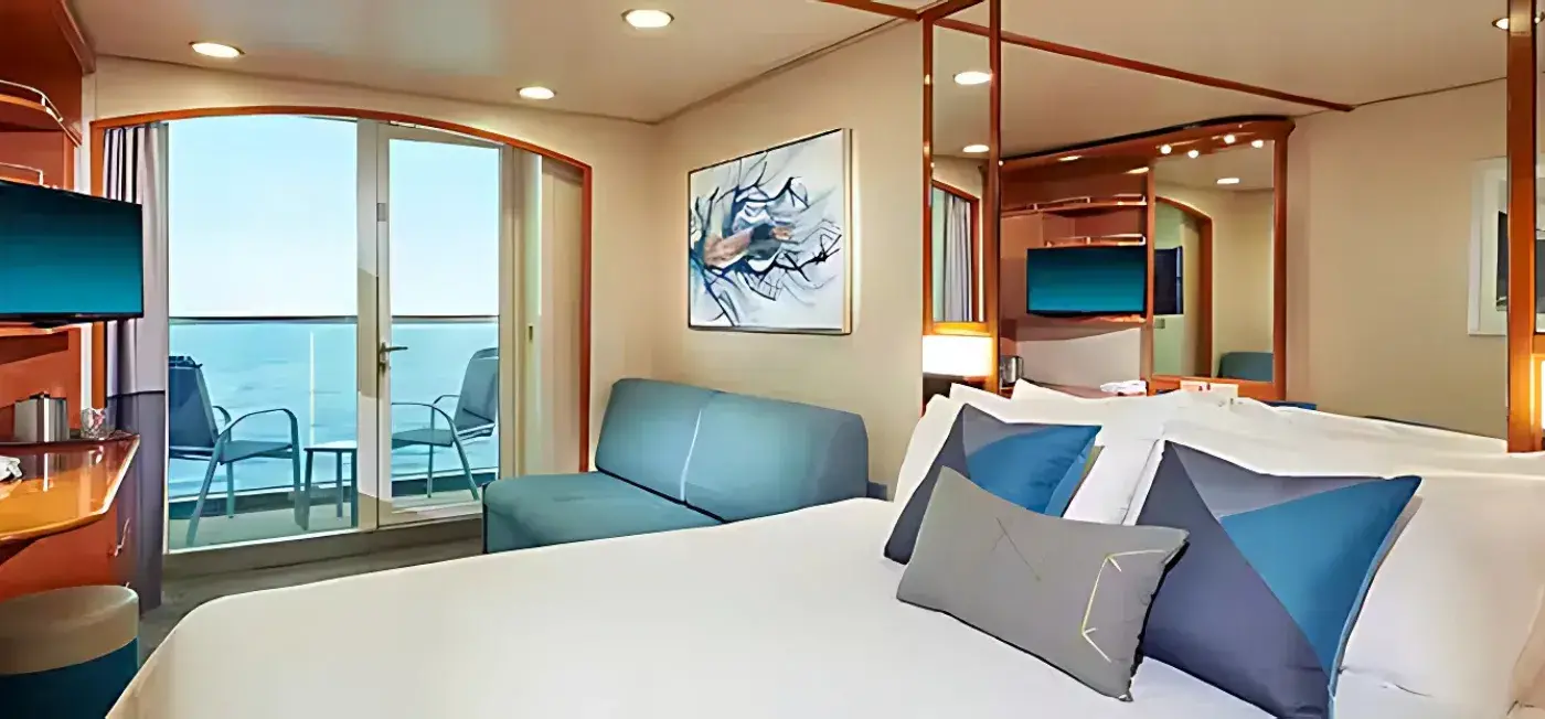 Balcony staterooms come with two lower beds that convert into a queen-size bed, with additional bedding for up to 2. Also includes a sitting area and floor-to-ceiling glass doors that open to a private balcony. Some can connect, offering more options when travelling with family or friends.
