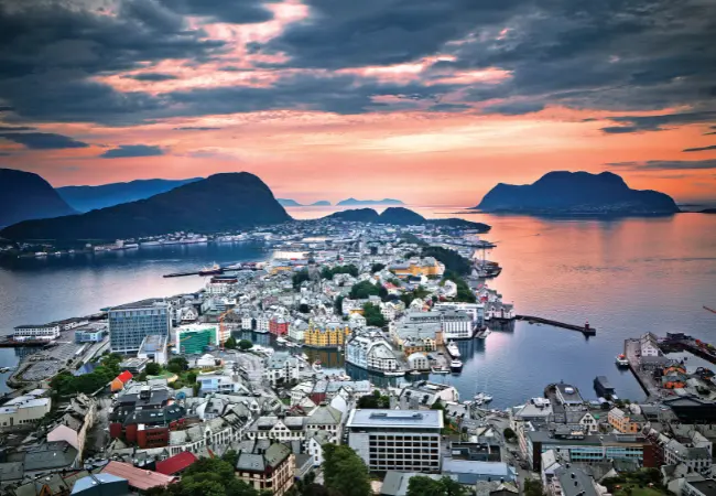 In 1904, a massive fire destroyed 800 buildings in this fishing port. Germany's Kaiser Wilhelm II responded with immediate aid, and Ålesund was reborn. Not surprisingly, the town was rebuilt in the then-popular Art Nouveau style known as Jugendstil. The result is one of the prettiest ports in Norway. Buildings with elegant turrets and spires can be seen lining the streets of the city centre. Today, the city is one of Norway's most important fishing harbours and the world's largest supplier of stockfish (Klippfisk) - dried cod. Alesund's major attractions are the surrounding fjords and the stunning Sunnmøre Alps.