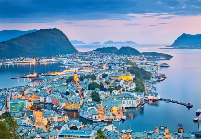 In 1904, a massive fire destroyed 800 buildings in this fishing port. Germany's Kaiser Wilhelm II responded with immediate aid, and Ålesund was reborn. Not surprisingly, the town was rebuilt in the then-popular Art Nouveau style known as Jugendstil. The result is one of Norway's most picturesque ports. Buildings with elegant turrets and spires can be seen lining the streets of the city centre. Today, the city is one of Norway's most important fishing harbours and the world's largest supplier of stockfish (Klippfisk) - dried cod. Alesund's major attractions are the surrounding fjords and the stunning Sunnmøre Alps.
