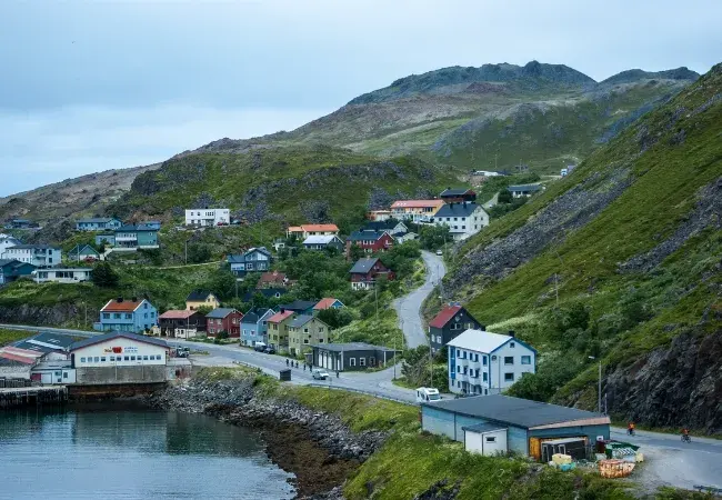 Honningsvåg is your gateway to Norway's North Cape on Magerøya Island. This is the northernmost point in Europe, and the true land of the midnight sun. From mid-May to July, the full disc of the sun never dips below the horizon. In winter, the days barely lighten to a spectral gloom. To the north lies only the remote Svalbard Archipelago, Jan Mayen Island, and the polar ice cap. From the cliffs of North Cape, perched 1,000 feet above the Arctic Ocean, one stares into the arctic silence.
